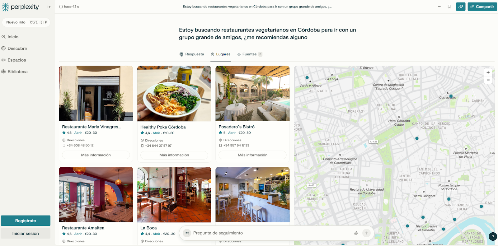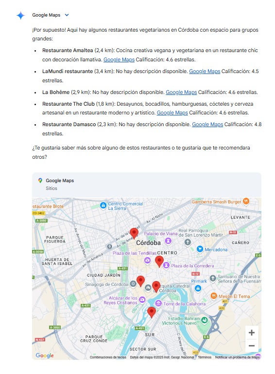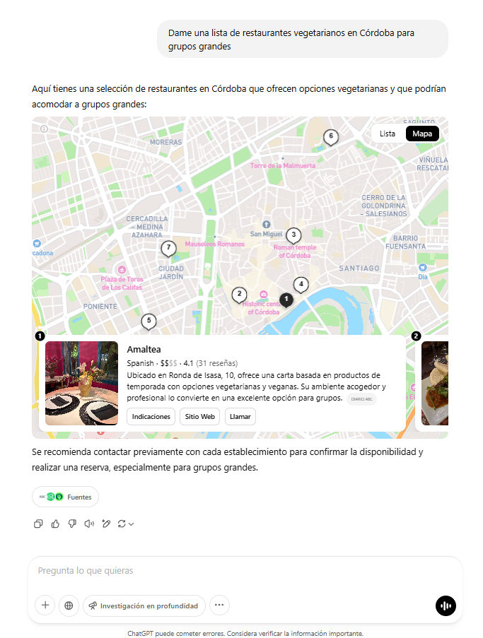 Por ejemplo, ante una consulta como “¿Me recomiendas restaurantes vegetarianos en Córdoba para grupos grandes?”, los buscadores con IA analizan fuentes como Google Maps, directorios locales, reseñas verificadas y medios digitales para generar una respuesta completa que realmente resuelva la intención del usuario.
